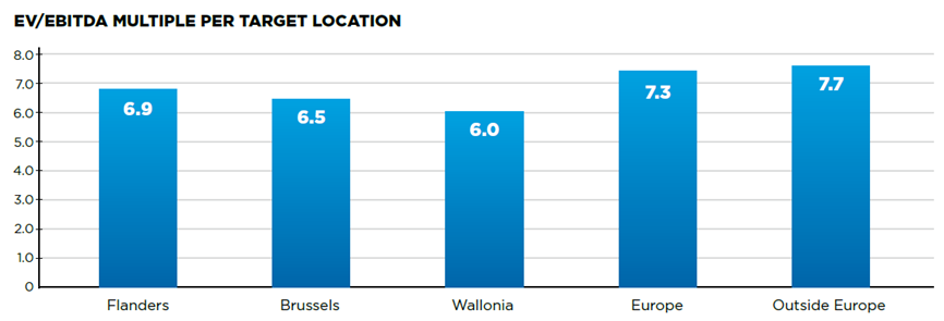 Voor het eerst werden ook de regio’s binnen België vergeleken. Wat blijkt? Vlaamse bedrijven worden gemiddeld tegen een hogere multiple (6,9) verkocht dan hun Waalse tegenhangers (6). Brusselse bedrijven bevinden zich tussenin (6,5). Vooral het kleinere (< €5mio) en middensegment (€5-€20mio) zorgen hier voor een verschil in multiple.